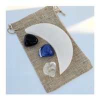 This set includes Clear Quartz, Sodalite, Black Tourmaline tumbled stones + a 4” Selenite moon.